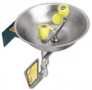 eyewash features a stainless steel bowl, dual aerated spray heads with automatic flow controls and flip-top dust covers. Universal emergency sign included. ANSI Z358.1 compliant.