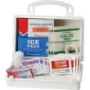 first aid kit is a small, portable, lightweight collection of essential first aid products for the care of occupational injury and illness, housed in a convenient plastic carrying case. Contents include: Adhesive Tape, 1/2" x 2 1/2 yd (1); Ice Pack, Small, Boxed (1); Antiseptic Towelettes (4); Flex Gauze, 2" (1); Aspirin (4); Sterile 3"x3" Gauze Pads (3); Sheer Bandages, 1"x3" (16); Emergency Medical Gloves, Pair (10); Triple Antibiotic Ointment (4).