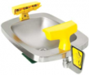 eyewash features a stainless steel bowl, dual aerated spray heads with automatic flow controls and flip-top dust covers. Universal emergency sign included. ANSI Z358.1 compliant.